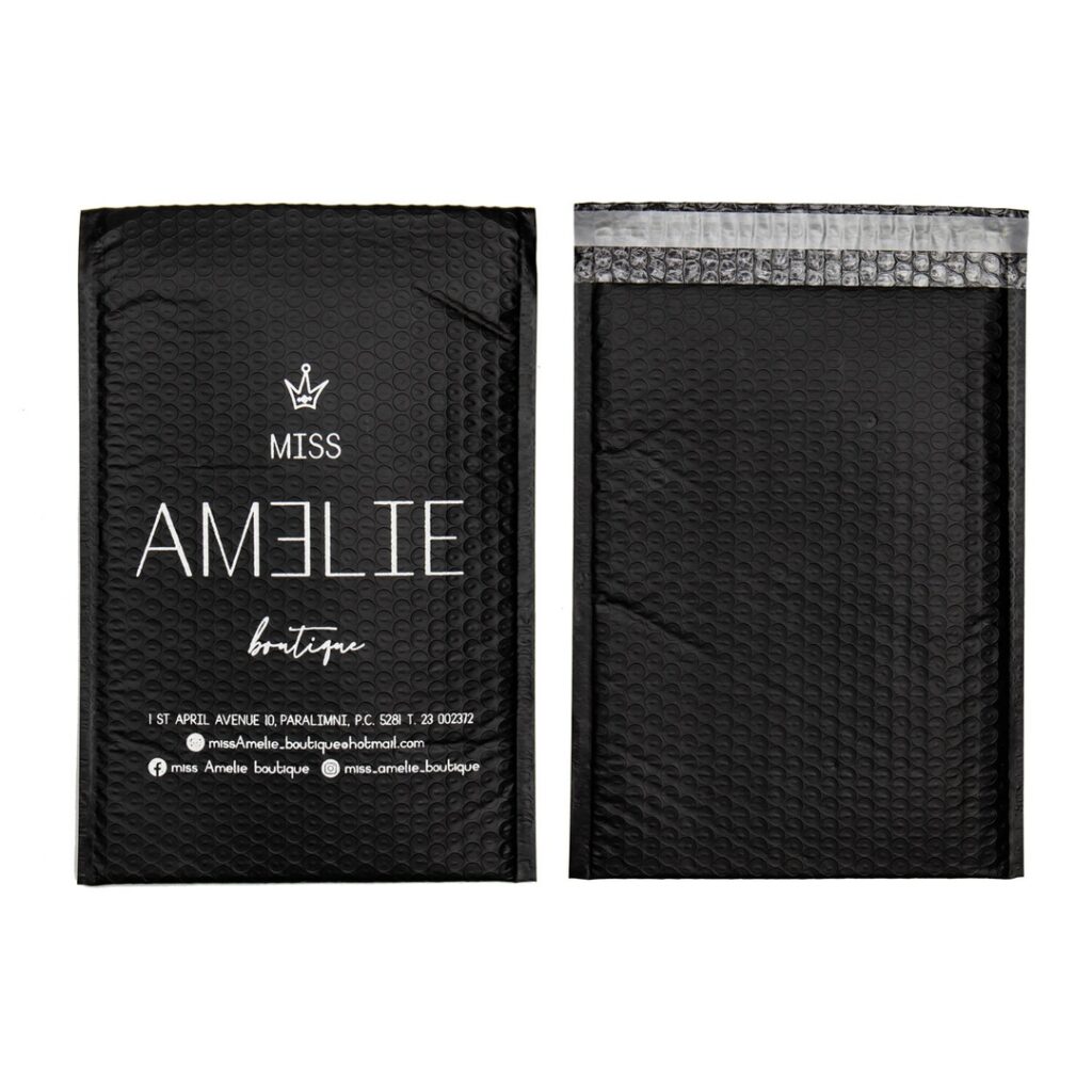 Μαύρος πλαστικός φάκελος κούριερ σε Ματ Σατινέ υφή, με επένδυση από φύλλο φυσαλίδας aeroplast (Τύπου Bubble), το οποιο προστατεύει το προιον απο χτυπήματα η γρατζουνιές κατα την διάρκεια μεταφοράς.
